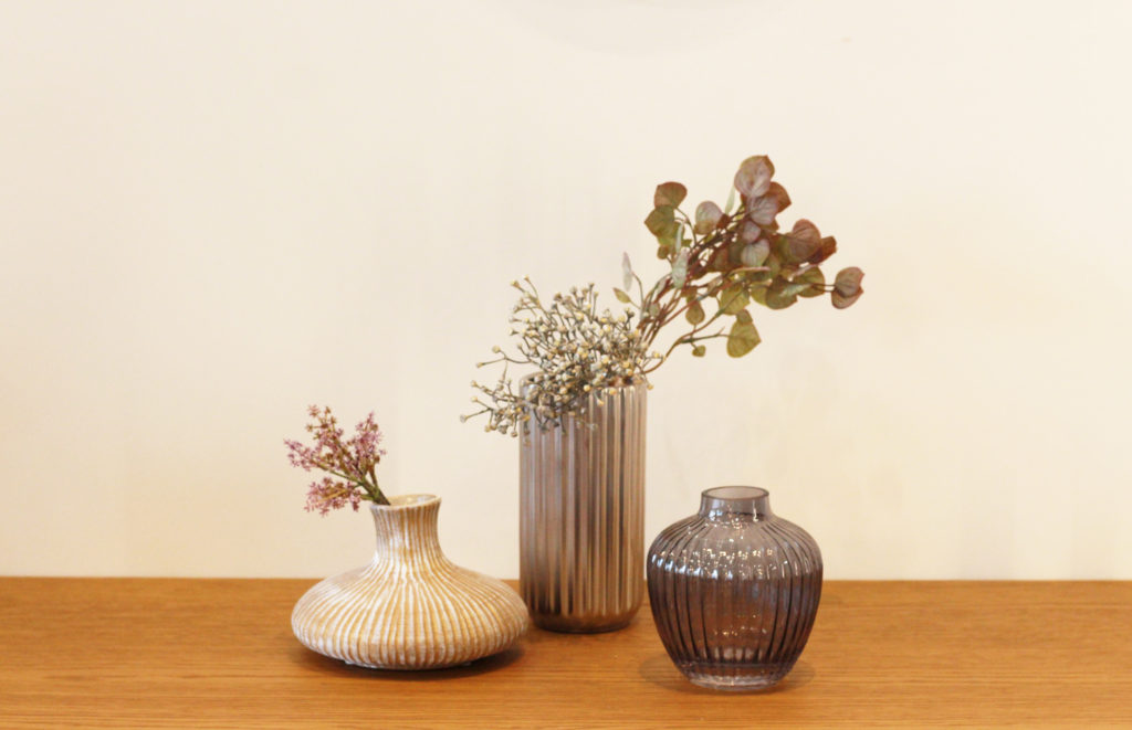異なる素材のフラワーベースが入荷しました。
